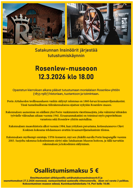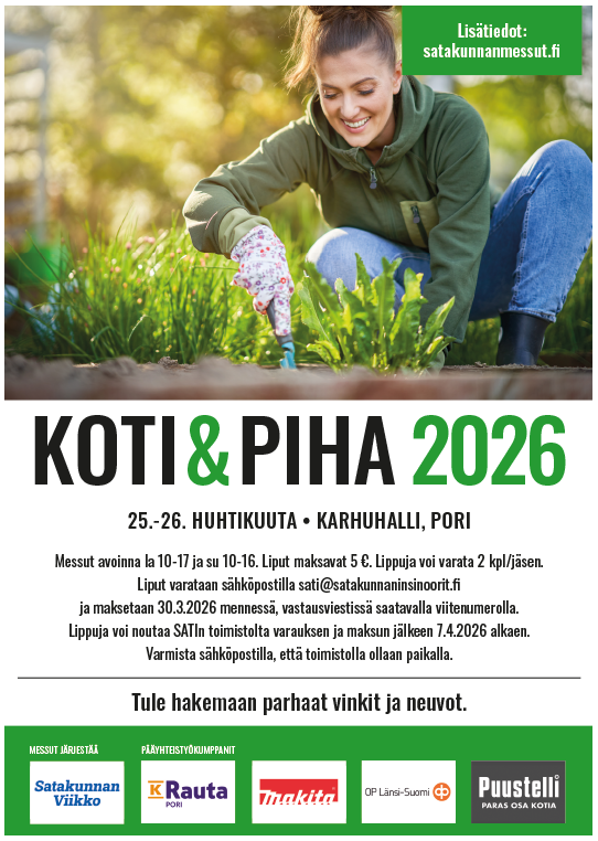 Messut avoinna la 10-17 ja su 10-16. Liput maksavat 5 €. Lippuja voi varata 2 kpl/jäsen. Liput varataan sähköpostilla sati@satakunnaninsinoorit.fi ja maksetaan 30.3.2026 mennessä, vastausviestissä…