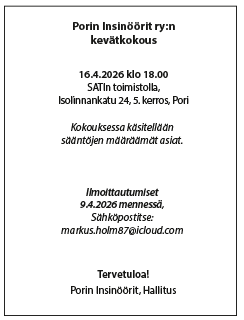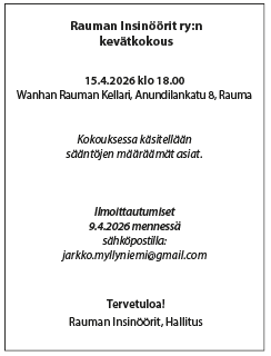 Kokouksessa käsitellään sääntöjen määräämät asiat. Ilmoittautumiset 9.4.2026 mennessä sähköpostilla: jarkko.myllyniemi@gmail.com