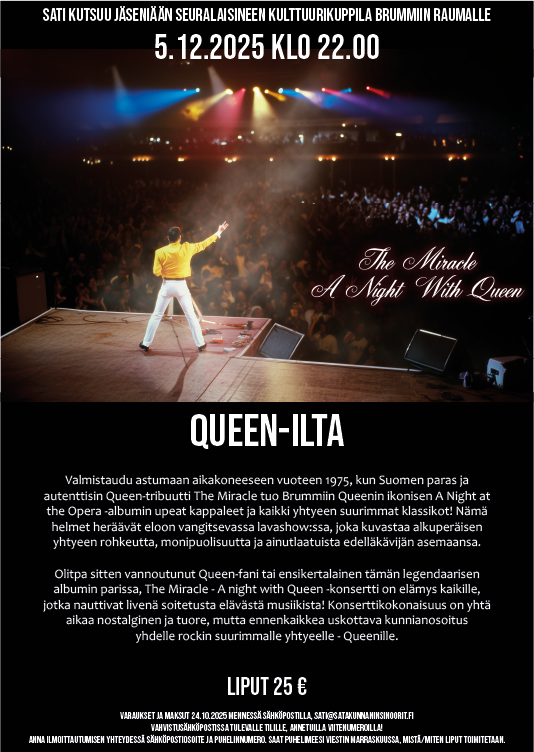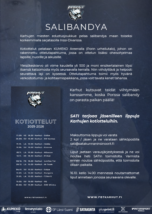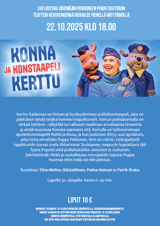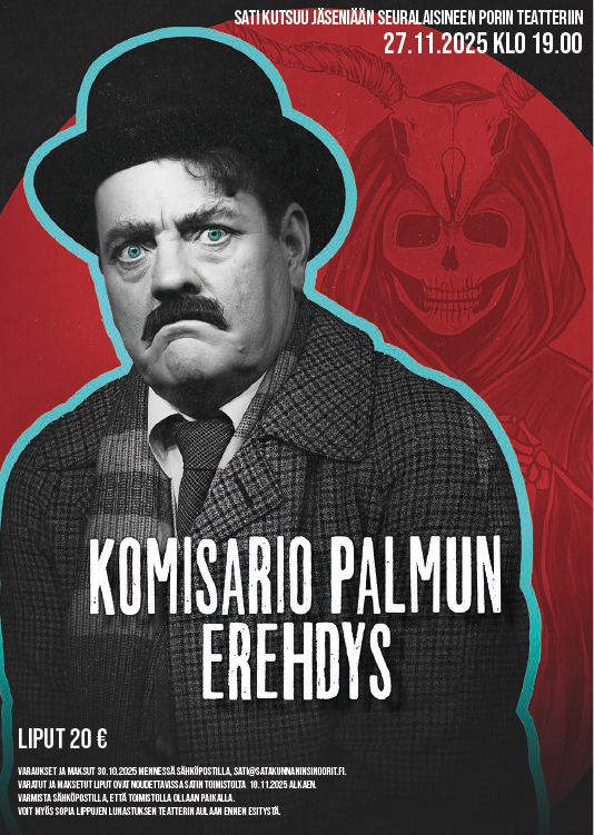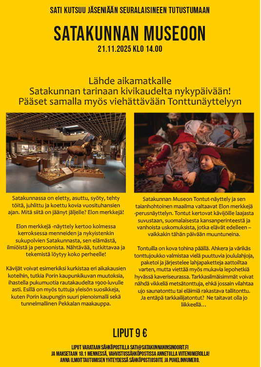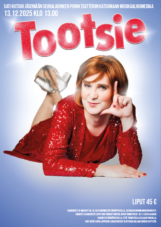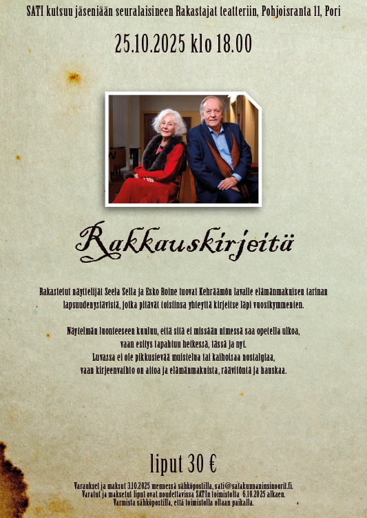 Liput 10 € Varaukset ja maksut 10.10.2025 mennessä sähköpostilla, sati@satakunnaninsinoorit.fi. Varatut ja maksetut liput ovat noudettavissa SATIn toimistolta 15.10.2025 alkaen. Varmista…