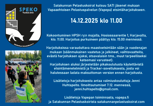 Satakunnan Pelastuskoirat kutsuu SATI jäsenet mukaan Vapaaehtoisen Pelastuspalvelun (Vapepa) etsintäharjoitukseen. Kokoontuminen HPSH ry:n majalla, Hosiossaarentie 1, Harjavalta, klo. 11.00. Harjoitus…