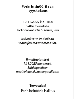 Kokouksessa käsitellään sääntöjen määräämät asiat. Ilmoittautumiset 1.11.2025 mennessä, Sähköpostitse: marihelena.kivinen@gmail.com