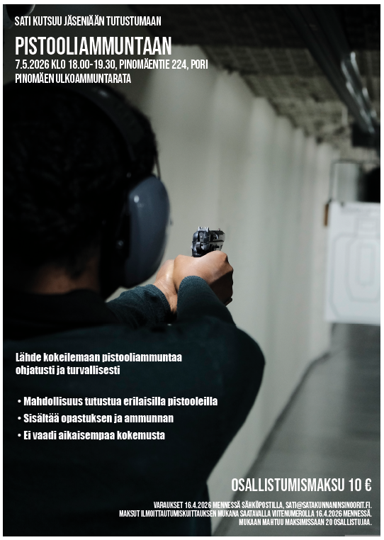 Lähde kokeilemaan pistooliammuntaa ohjatusti ja turvallisesti - Mahdollisuus tutustua erilaisilla pistooleilla - Sisältää opastuksen ja ammunnan - Ei vaadi aikaisempaa kokemusta Osallistumismaksu 10 €…