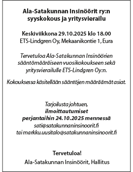 Tervetuloa Ala-Satakunnan Insinöörien sääntömääräiseen vuosikokoukseen sekä yritysvierailulle ETS-Lindgren Oy:n. Kokouksessa käsitellään sääntöjen määräämät asiat. Tarjoilusta johtuen,…